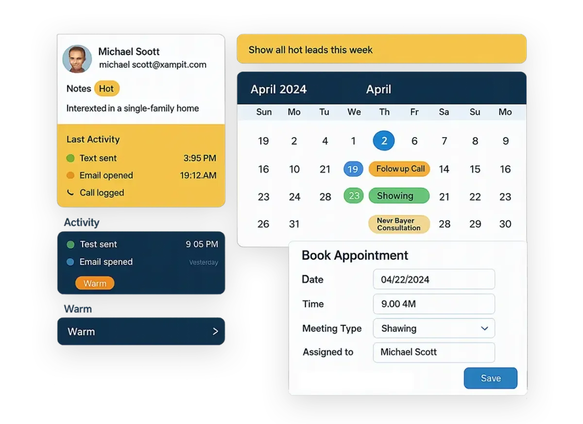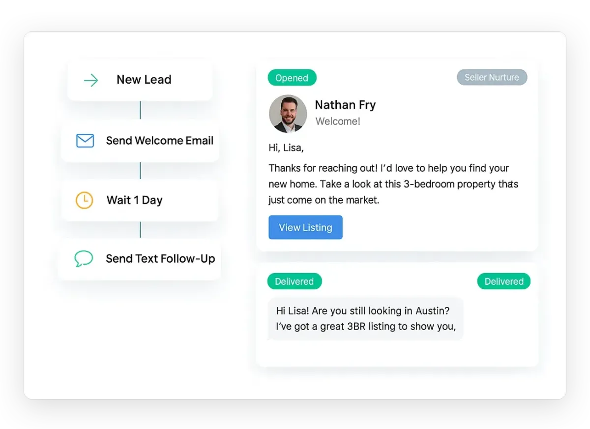 With AI-powered text and email automation, every lead gets a timely, professional response—day or night. Prebuilt campaigns and instant follow-ups keep conversations moving, so you stay top of mind without lifting a finger.