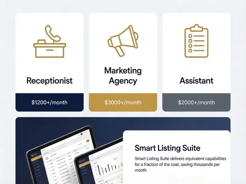 Hiring a receptionist ($1200-$2500/month), Marketing Agency ($3000-$5000/month), Assistant ($2000-$3500/month) can cost $5K to $10K per month. Smart Listing Suite delivers equivalent capabilities for a fraction of the cost saving thousands per month - while you keep your independence.